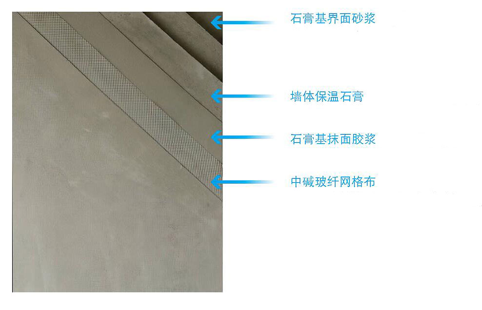 轻质石膏外墙内保温系统:由石膏界面层、墙体保温石膏保温层、石膏抹面胶浆层和饰面层构成,设置在外墙内侧,起墙体保温、隔热作用的保温系统。